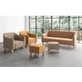 Декоративная вставка на спинке с утяжкой и деревянные ножки придают изделию официальный вид и задают деловой тон всему помещению.