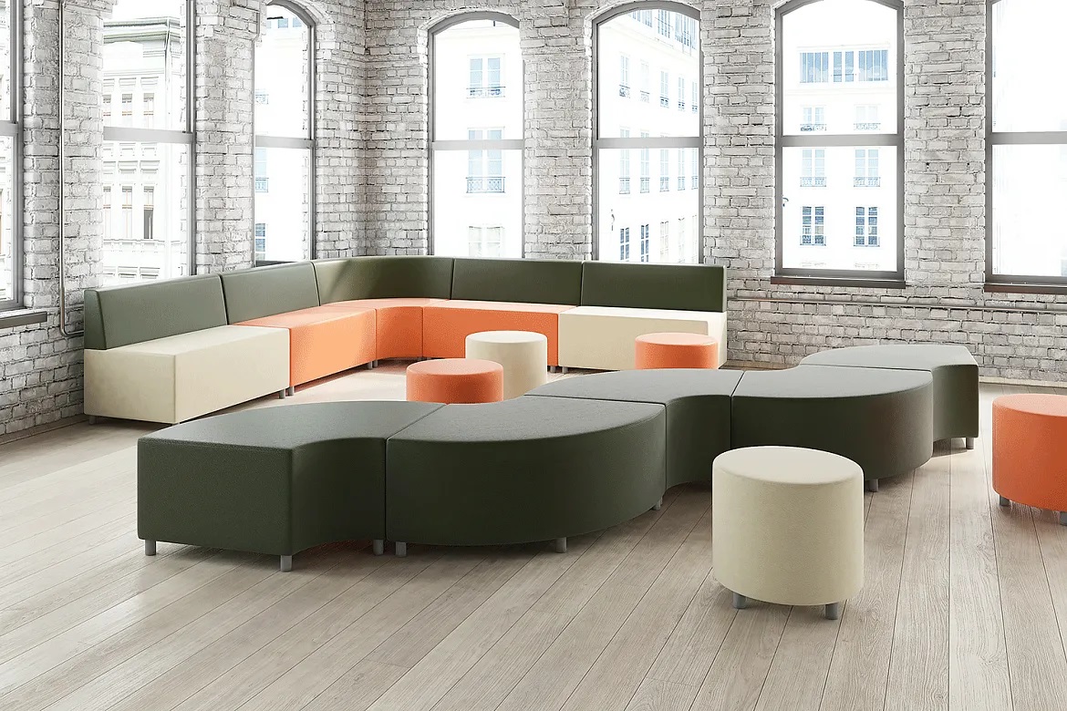 Серия “МОБИЛЕ” состоит из модулей и пуфов двух глубин, что позволяет создавать комфортную и функциональную обстановку в помещениях с ограниченным пространством и колоннами.
