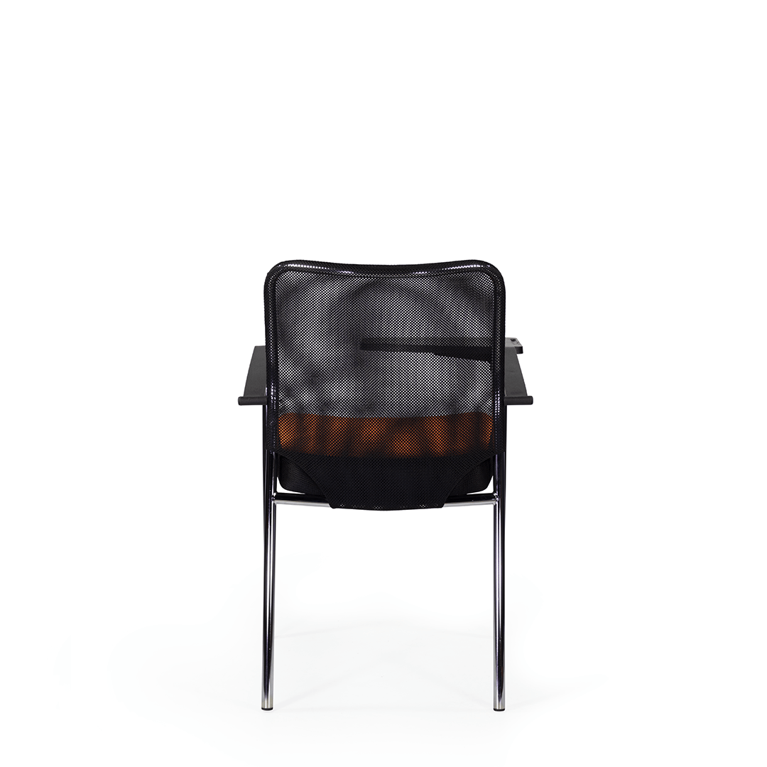 Кресло для посетителя изготавливается с мягким сиденьем, оригинальной спинкой, выполненной из сетчатой ткани и пластиковыми подлокотниками.