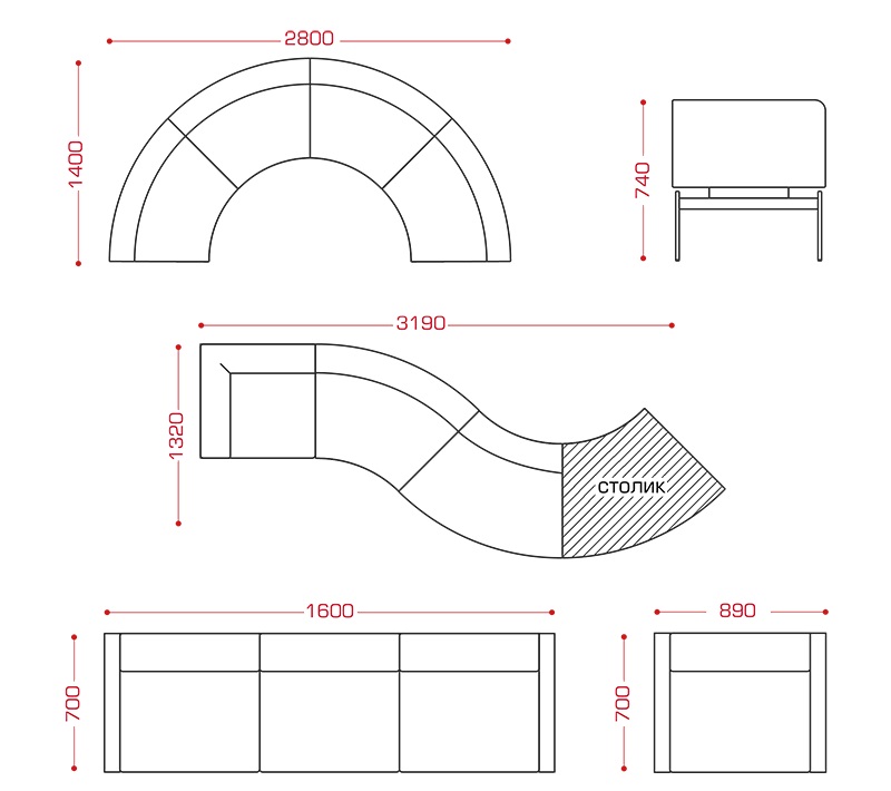 Сиденья имеют деревянную раму, наполнение из пенополиуретана и облицовку из мебельной ткани или экокожи.