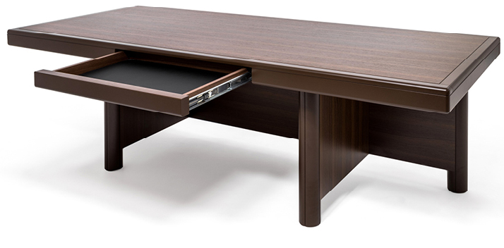 В столешнице письменного стола имеется выдвижной пенал на роликовых направляющих с плавным закрыванием. Внутренние размеры пенала 65х45 см. Дно пенала обтянуто натуральной кожей черного цвета.